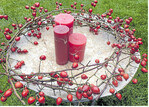 Material: Circa 6 Hagebuttenranken, Bindedraht Und so wird es gemacht: 1. Die Hälfte der Ranken einfach wechselseitig (umgedreht) auf die andere Hälfte legen. So erhält man eine runde Form anstelle eines eiförmigen Werkstücks. Es ist also auf diese Weise einfacher, eine schöne Rundung zu erhalten. | 2. Mit Bindedraht an verschiedenen Stellen fixieren oder umschlingen. Weitere Ranken aufbinden, bis das gewünschte Volumen erreicht ist. | 3. Auf einer selbstgebastelten Schale aus Silberblatt wirkt es besonders schön. In der Mitte der Schale können Kerzen in verschiedenen Höhen oder ein kleines Physaliskränzchen arrangiert werden. Der Kranz kann auch als Wand- oder Türschmuck aufgehängt werden.