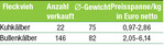 Am 6. Oktober wurden 180 Tiere zum Kauf angeboten. Einen Preisrückgang mussten die Kuhkälber hinnehmen. Eine gute Qualität traf auf eine schwache Nachfrage. So waren die weiblichen Kälber im Schnitt um 2,05 Euro pro kg bei 75 kg Gewicht zu haben. Der weibliche Fresser fand leider keinen Käufer. Die Bullenkälber gaben saisonal bedingt im Preis weiter nach, allerdings zeigten sich die Tiere von vorzüglicher Qualität. 147 der 146 aufgetriebenen Bullenkälber konnten um 4,98 Euro pro kg bei einem mittleren Gewicht von 82 Kilogramm zugeschlagen werden, was einem Kopfpreis von 412 Euro entspricht. Junge, gut entwickelte Kälber zwischen 65 und 75 kg erzielten den höchsten Kilopreis. Die männlichen Fresser konnten flott verkauft werden.