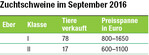 Der Eberverkauf lag im September bei 100 Tieren mit einem Durchschnittspreis von über 1000 Euro. Die Mehrzahl der verkauften Tiere stand in Klasse I – meist mit genomischen Zuchtwerten aus der Typisierung. Der Eberverkauf der Deutschen Landrasse war erfreulich gut. Aus der Zucht Klaus und Philip Benz kamen sehr gut entwickelte Nachkommen von Sudan, Beckstar und Rabenz zum Verkauf. Sie zeigten sehr gute Länge und ein stabiles Fundament, dazu hohe Zunahmen bei geringem Rückenspeck. Die Sudan- und Rabuck-Jungeber von Tobias Peter in Aach-Linz wiesen ebenso guten Wuchs, Fleischansatz und ausgezeichnetes Exterieur vor. Bei der Rasse Piétrain brachten Export und Besamung guten Umsatz. Beim Zuchtbetrieb Manfred und Andreas Sommer, Unterhof,...
