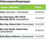 Das Bundesamt für Verbraucherschutz und Lebensmittelsicherheit (BVL) hat die Zulassung von Pflanzenschutzmitteln, deren Zulassung durch Zeitablauf endete, verlängert. Diese Zulassungsverlängerungen werden bis zur endgültigen Entscheidung über eine erneute Zulassung erteilt. Die Mittel für den Acker-, Obst- und Gemüsebau sind in der Tabelle zusammengestellt.
