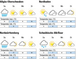 In der Nacht auf Samstag ziehen von Südwesten her Niederschläge auf, die Schneefallgrenze sinkt bis 800¿m Höhe. Tagsüber bringt frischer Wind aus Südwesten dichte Wolken und gebietsweise Niederschläge. Die Temperaturen erreichen maximal 8¿°C im nördlichen Rheintal und 3¿°C auf der Alb. Am Sonntag dreht der Wind leicht auf Südosten, gebietsweise zeigt sich die Sonne, die Temperaturen steigen bis 11¿°C im Rheintal und am mittleren Neckar und 7¿°C auf der Alb, später sind in Hochlagen Schauer möglich. Am Montag wechseln Wolken und Sonne bei leichtem Wind aus Süd bis Ost und maximal 13¿°C in den Flussebenen und 8¿°C auf der Alb. Am Dienstag scheint meist die Sonne bei schwachem Wind. In den folgenden Tagen wird es wieder kühler und die...