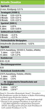 Was kostet das Geld? Mit der aktuellen Zinstabelle bietet BWagrar einen neuen Service an. Die Tabelle gibt einen schnellen Überblick über die Konditionen und hilft Ihnen bei der Suche nach günstigen Kreditangeboten sowie bei der Geldanlage und Kontoführung. Sie erscheint künftig regelmäßig im Abstand alle vier bis sechs Wochen.