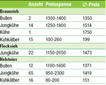 Braunvieh: Bei den Bullen wurde der Markt am 7. Dezember geräumt. Körsieger wurde ein genomisch typisierter Hupays-Sohn von Jürgen Held, Donaustetten. Die Mutter, eine Highway-Tochter, wies eine erste Laktation von 9200 kg Milch vor. Den Reservesieger, ebenfalls ein Hupays-Sohn, stellte der Betrieb Heckenberger GbR aus Hochdorf. Flott kamen die Gebote bei den Jungkühen. Eine klasse Hulk-Tochter stellte der Betrieb Edwin Kling, Murrwangen, zum Verkauf. Eine Spitzenjungkuh präsentierte Erwin Bühler, Hittisweiler, mit einer Vivid-Tochter. Weitere Spitzentiere kamen von Gebhard Heim mit einer Payssli-Tochter sowie Hermann Miller mit einer Juleng-Tochter. Die Zuchtkälber konnten flott verkauft werden. Fleckvieh: Mit 2050 Euro teuerste Jungkuh...