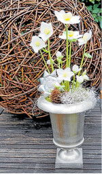 Material: Christrose Silberfarbenes Gefäß Granulat Moos, Tannenzapfen Draht und Dekoartikel Und so wird es gemacht: 1. Eigentlich ist die Christrose eine winterharte Staude, die Kälte bevorzugt und den Eingangsbereich zum Haus oder den Balkonkasten schmückt. Doch seit einigen Jahren haben pfiffige Gärtner eine Besonderheit herausgefunden: Werden alle Blätter entfernt, sodass nur noch die Blütenknospen verbleiben, wird die Christrose zu einer Indoor-Fensterbankpflanze, die zuverlässig blüht. Man sollte jedoch beim Kauf auf das Schildchen „Indoor" achten. In einem schönen Gefäß vervollständigen sie die Dekoration zum Silvesterabend. Oder sie dient auch als ein hübsches Gastgeschenk oder Dankeschön für die Einladung. 2. Auf den Gefäßboden...
