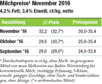 Die Erholung der Milchpreise hat sich im November 2016 weiter fortgesetzt. Im gewogenen Mittel stieg der BWagrar-Preis deutlich um 2,7 Cent auf jetzt 32,2 Cent im November. Dieser Preis ist konservativ gerechnet. Unberücksichtigt sind die meisten GVO-Zuschläge und sowie der Alpenmilchpreis bei Omira, ebenso sind die von einigen Unternehmen angekündigten und zum Teil auch schon bezahlten Nachzahlungen nicht in dem Preis enthalten. Fest steht: Erstmals in diesem Jahr lagen jetzt im November alle neun im Preisspiegel betrachteten Molkereien wieder über 30 Cent. Laut Marktbericht der Kemptener Börse vom 7. Dezember werden die Milchprodukte auf einem hohen Niveau, zu stabilen Konditionen gehandelt. Die Rohstoffpreise für Magermilchkonzentrat...