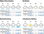 Am Samstag bringt auffrischender Westwind dichtere Wolken und im Tagesverlauf einzelne Schneeschauer bei Temperaturen bis 2°C im Breisgau, -2°C im Kraichgau und am Bodensee und -4°C auf der Alb und im Hochschwarzwald. Am Sonntag bringt frischer Westwind dichte Wolken und einzelne Schneeschauer, die Temperaturen erreichen bis 5°C im Breisgau, 3°C im Kraichgau, 1°C am Bodensee und -2°C auf der Alb und im Hochschwarzwald. Zum Montag wird der Wind stark und bringt weiter steigende Temperaturen und Schauer, die in den Ebenen in Regen übergehen. Am Dienstag lassen Wind und Schauer von Westen her etwas nach und die Temperaturen halten sich. In den Folgetagen beruhigt sich das Wetter etwas, in den Ebenen bildet sich Hochnebel und in Hochlagen...
