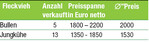 Bei der RBW-Auktion am 5. Januar wurden sieben Bullen und 13 Jungkühe angeboten und bis auf zwei Bullen flott verkauft. Den Spitzenpreis brachte ein Hubraum-Sohn vom Betrieb Berger, Herbertingen-Mieterkingen. Der Verkauf der 13 Jungkühe verlief flott. Der Preis stieg gegenüber November um 100 Euro auf 1530 Euro. Mit 1850 Euro kam eine Heiduck-Tochter von Clemens Baumann, Hausen vor Wald auf den Höchstpreis.