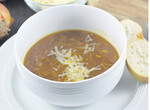 Zwiebeln schälen, in feine Streifen schneiden. Butterschmalz in einem Topf erhitzen, die Zwiebeln darin etwa 10 Minuten anrösten, bis sie angebräunt sind. Dann mit Mehl bestäuben und unter Rühren das Mehl anrösten. Mit dem lauwarmem Rinderfond ablöschen, Nelken und Lorbeerblatt zugeben und 20 bis 30 Minuten köcheln lassen. Mit Salz abschmecken, in Suppentassen einfüllen und mit Käse bestreuen. Mit dem Baguette servieren.