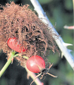Was sind das für seltsame Gebilde auf den Hagebutten? M. P. aus A. Es handelt sich um einen Gallapfel. Er wird hervorgerufen von der 4 mm großen Rosengallwespe. Im Frühjahr legen die Weibchen Eier in die Seitenknospen der vorjährigen Triebe. Die Knospe wächst ungewöhnlich groß heran, sie erreicht Durchmesser um 5 cm. In ihrem Inneren leben und fressen die Larven der Gallwespe. Sie verpuppen sich darin erst im folgenden Frühjahr. Eine Bekämpfung ist nicht notwendig, weil es zu keiner Wachstumsbeeinträchtigung kommt. Wenn viele Galläpfel das Aussehen stören, kann man sie im Laufe des Winters entfernen. Die erst gelben, später roten Gallen bleiben zwei oder drei Jahre lang an den Trieben und vertrocknen mit der Zeit. Dass sich Galläpfel auf...