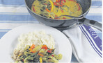 600 g Baby-Pak Choi 1,5 Tassen Reis 2 Gemüsepaprika (rot, orange) 3 EL Oliven- oder Sesamöl 6 Babymöhren 100 ml Gemüsebrühe 1 Dose Kokosmilch (ca. 200 ml) 1 TL Currypulver 1 TL Ingwerpulver schwarzer Pfeffer 1 TL Salz 2 EL gehackte Petersilie 50 g Cashewkerne
