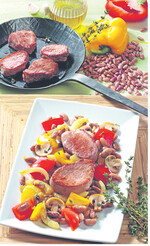 250 g Wachtel-Bohnen 750 ml Wasser 1 Würfel Gemüsebrühe 500 g Schweinefilet 1 Knoblauchzehe 1 große Zwiebel 1/2 gelbe Paprikaschote 1/2 rote Paprikaschote 1 Fenchelknolle 100 g Champignons 1 walnussgroßes Stück Ingwer 3 EL Olivenöl 1 EL Butter Salz, Pfeffer 1/2 TL Kurkuma (oder 1 TL Curry) Zitronensaft 2 – 3 Thymianzweige