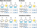 Die Niederschläge der vergangenen Woche brachten endlich etwas Bodenfeuchte. Der Samstag beginnt noch teils sonnig, dann bringen Wolken in einigen Gebieten ergiebigen Regen bei Maxima bis 25¿°C in Rhein- und Neckartal sowie am Bodensee, 15¿°C auf der Alb und 10¿°C im Hochschwarzwald. Am Sonntag regnet es bei Nordwind vor allem im Süden weiter und die Temperaturen erreichen kaum über 20¿°C in den Ebenen und 10¿°C im Hochschwarzwald. Der Montag wird voraussichtlich meist bewölkt mit anhaltendem Regen und Temperaturen von 15 bis 20¿°C in den Ebenen und 10¿°C in Hochlagen. Am Dienstag lassen die Niederschläge von Norden her nach und die Temperaturen erreichen stellenweise über 20¿°C. In der weiteren Woche nehmen Temperaturen und Sonnenstunden...