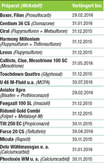 Das Bundesamt für Lebensmittel und Verbraucherschutz hat die Zulassung von Pflanzenschutzmitteln vorübergehend verlängert. Die für den Acker-, Obst-, Gemüse- und Weinbau bedeutsamen Mittel sind in der Tabelle zusammengestellt: