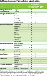 Seit 15. August gilt die Schadschwelle von 45 Prozent befallenen Blättern. Dabei gilt nach wie vor, dass ein Blatt durch einen Fleck als befallen gilt. Bislang ist von den zehn Regionen in Baden-Württemberg nur die Region „Östliches Hohenlohe" noch nicht bewarnt und nach wie vor unter der Schadschwelle. Die Schadschwellen haben sich über die Jahre bewährt. Am Ende ist jedoch die Betriebsleitererfahrung in punkto Schadschwelle gefragt. Ein Betrieb im Rheintal mit Rodung für die Abholung in der zweiten Lieferrunde muss sensibler reagieren wie ein Anbauer in weniger befallsgefährdeten Regionen mit früher Rodung. Wichtig ist, wie stark der Schlag oder angrenzende Schläge in vorhergehenden Jahren von Blattflecken befallen waren. Hier „brodelt"...