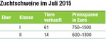 Das anhaltende Tief im Schlachtschweinemarkt setzte den Absatz der Ferkel vermehrt unter Druck. Beim Verkauf von Zuchtebern ging es im Juli ebenso ruhig zu. Die Nachfrage war auch wetterbedingt im Export eher verhalten. Aufträge kamen unter anderem aus Belgien und Rumänien sowie von Besamungsstationen. Weitere Bestellungen für die kommenden Monate liegen ebenfalls vor. Von den 75 in Baden-Württemberg verkauften Ebern war die Mehrzahl in Klasse I bewertet. Der Durchschnittspreis lag bei ca. 1000 Euro. Eber der Deutschen Landrasse wurden im Juli nur wenige gehandelt. Die Spitzeneber, ein Sulfat- und ein Calmus-Sohn, gezüchtet von Klaus und Philipp Benz in Bingen, zeigten sehr gute Länge, die erforderliche Bemuskelung und ein stabiles...
