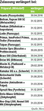 Das BVL hat die Zulassung von Pflanzenschutzmitteln verlängert. Diese Zulassungsverlängerungen werden bis zur endgültigen Entscheidung über eine erneute Zulassung erteilt. Die für den Acker-, Obst-, Gemüse- und Weinbau bedeutsamen Mittel sind in der Tabelle zusammengestellt: