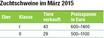 Wie im Vorjahr besserte sich im März das Preisniveau bei der Vermarktung von Ferkeln und Schlachtschweinen. Diese Stimmung übertrug sich teilweise auf den Ebermarkt. Die gute Nachfrage seit Jahresanfang ließ die Verkaufszahlen der Eberzüchter in Baden-Württemberg für das erste Quartal gut aussehen. Im März musste man rein statistisch eine niedrige Stückzahl verzeichnen, da etliche Bestellungen noch nicht abgewickelt waren. Ingesamt wurden rund 70 Jungeber verkauft. Mit über 40 Tieren der Klasse I, meist mit hohen Zuchtwerten aus der Typisierung, boten die Piétrain-Zuchtbetriebe eine sehr gute Qualität. Eber der Deutschen Landrasse wurden im März nicht bewertet und gehandelt. Bei der Rasse Piétrain sind die Jungeber aus der Zucht Eckhard...