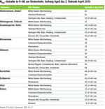 Für die letzten beprobten Winterungen lagen die Werte bei einer Bodentiefe von 0–90 cm bei 44 kg N/ha. Für alle Ackerbau-Standorte mit sämtlichen Sommerungen sind durchschnittlich 58 kg N/ha in einer Bodentiefe von 0–90 cm verfügbar. Unter den Sommerungen ohne Mais wurde ein durchschnittlicher Nmin-Gehalt von 47 kg N/ha in einer Bodentiefe von 0–60 cm erreicht. Für Standorte, die eine durchwurzelbare Bodentiefe von mehr als 60 cm aufweisen, aber nur auf zwei Schichten beprobt wurden, sollten für die 3. Schicht folgende Werte zusätzlich angerechnet werden: Körnermais 13 kg N/ha und Silomais 11 kg N/ha.