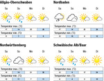 Nach einer anfangs feuchten, weitgehend frostfreien Woche ist die Vegetation in vollem Gange. Am Samstag vertreibt der Ostwind die Wolken, die Temperaturen erreichen in den Flussebenen über 20°C, auf der Alb etwa 10°C, dann frischt der Westwind rasch auf und bringt Schauer, vereinzelt auch Gewitter. Zum Sonntag ist in den Hochlagen leichter Frost möglich, der Tag wird wechselhaft und kühler, bei maximal 5°C bis 18°C. Am Montag klart es auf und die Temperaturen steigen rasch bis 20°C in den Ebenen. Am Dienstag können die Temperaturen fast 30°C erreichen. Ab Mittwoch ist mit etwas unbeständigerem und kühlerem aber frostfreiem Wetter zu rechnen. | →Mehr Wetter im Internet unter www.bwagrar.de. Geben Sie oben rechts ihre Postleitzahl...