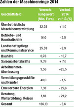 Auch im Geschäftsjahr 2014 haben sich die 30 Maschinenringe im Land gut weiterentwickelt. Nach Angaben des Landesverbandes lag die Mitgliederzahl mit 27.521 leicht über der Vorjahresmarke. Umsatzrückgänge, etwa im Segment der erneuerbaren Energien durch den Einbruch bei Fotovoltaik, konnten durch Zuwächse in anderen Bereichen weitgehend ausgeglichen werden. Insgesamt beziffert sich der Gesamtverrechnungswert auf 136,1 Mio. Euro (2013: 141,2 Mio. Euro).