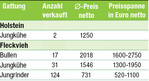 Am 23. April fand die traditionelle Frühjahrsauktion in Ilshofen statt. Zum üblichen Angebot an melkenden Tieren und Kälbern kamen auf Spermatauglichkeit geprüfte Jungbullen und eine große Anzahl an Jungrindern zum Verkauf. Holsteins: Die beiden Jungkühe konnten für jeweils 1250 Euro verkauft werden. Fleckvieh: 19 der 20 auf Spermatauglichkeit untersuchten Jungbullen schafften das geforderte Prädikat „deckt und befruchtet" und erfreuten sich einer sehr regen Nachfrage. Die 17 verkauften Tiere erlösten einen Durchschnittspreis von 2018 Euro. Am begehrtesten war ein von Familie Klenk aus Kirchberg- Dörrmenz angebotener Hutera-Sohn, der den Tageshöchstpreis von 2750 Euro erzielte. Preislich folgte mit 2600 Euro ein HurricanSohn aus einer...