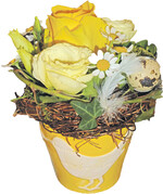 Material: ein kleiner Übertopf, Steckmasse für Frischblumen, Zweige, Schnittblumen sowie etwas Dekomaterial nach Wahl, Drahthaften, Efeu- oder Pachysandrablätter Und so wird‘s gemacht: In einen kleinen Übertopf wird ein feuchter, gut in Wasser getränkter Steckschwamm gefüllt, der etwa einen Zentimeter über dem Gefäßrand steht. Die Kanten mit einem Messer leicht anschrägen. Aus Ackerwinde oder Birkenzweigen wird in der Größe des Topfes ein kleines Kränzchen geformt und mit Drahthaften auf der Steckmasse befestigt. Steckmasse mit mit Efeu- oder Pachysandrablättern leicht bedecken. Bei einem kleinen Gesteck reichen circa drei Blüten – Rose, Ranunkel oder Schneeball – und etwas Verspieltes wie die Kamille völlig aus. Bei einem großen sind...