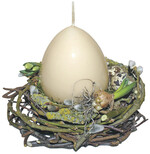 Material: ein paar Zweige wie Wilder Wein, Knöterich, Clematis oder Birke, Schablone, Moos, kleine Hölzer vom Obstbaumschnitt, Wachteleier, Federn, Traubenhyazinthe mit Zwiebel Und so wird‘s gemacht: Die Zweige werden so oft um den Handrücken gewickelt, bis eine Nestform entsteht. Dann an zwei Stellen mit etwas Draht fixieren. Es können auch verschiedene Materialien gemischt werden. Aus Pappe wird eine Schablone geschnitten und mit Heißkleber auf die kranzähnliche Form geklebt. Das Kerzenei anschließend auf die Innenseite der Schablone festkleben und die Zwischenräume mit Moos ausfüllen. Kleine Hölzer vom Obstbaumschnitt, Wachteleier, Federn und, als kleines Highlight, eine Traubenhyazinthe mit Zwiebel machen diese einfache Dekoration zu...