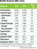 Die BayWa AG, München, erzielte im Geschäftsjahr 2014 im Konzern einen Umsatz von 15,2 (Vorjahr: 16) Mrd. Euro. Das Ergebnis vor Steuern und Zinsen (EBIT) liegt bei 147 (Vorjahr: 222) Mio. Euro. Vorstand und Aufsichtsrat schlagen der Hauptversammlung die Erhöhung der Dividende von 0,75 auf 0,80 Euro pro Aktie vor. Das wäre doppelt so viel wie 2009.