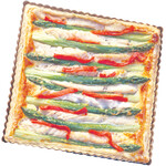 300 g Blätterteig (TK) 400 g grüner Spargel Salz 400 g Seelachsfilet 50 g Seelachsscheiben in Öl 2 Eier 250 g Crème fraîche Pfeffer aus der Mühle 50 g geriebener Parmesan Mehl zum Ausrollen Fett für die Form