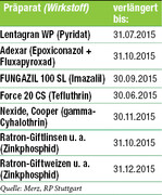 Das BVL hat die Zulassung von folgenden Pflanzenschutzmitteln, deren Zulassung durch Zeitablauf endete, vorübergehend verlängert: