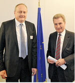 EU-Haushaltskommissar Günther Oettinger (r.) und DBV-Präsident Joachim Rukwied trafen sich in Brüssel zu einem Gespräch über die Finanzierung der Gemeinsamen Agrarpolitik (GAP) nach 2020. Oettinger sprach sich für eine Weiterentwicklung der GAP aus, die auch die Leistungsfähigkeit der europäischen Landwirtschaft im Blick haben müsse und nicht allein Extensivierung und Ökologisierung. Der Haushaltskommissar will in diesen Fragen eng mit dem Bauernverband zusammenarbeiten.