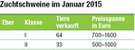 Im Januar zeigte sich der Schweinemarkt mit wenigen Schwankungen bei den Schlacht- und Ferkelpreisen, aber immer noch auf sehr niedrigem Niveau. Die Eberzuchtbetriebe in Baden-Württemberg spürten ebenfalls eine ruhige, gleichzeitig aber kontinuierliche Nachfrage nach Jungebern. Der Export lief wie gewohnt mit weiteren Aufträgen für die kommenden Monate. Dazu gingen viele qualitativ hochwertige Jungeber in die Besamung und in andere Bundesländer, besonders die in „Genom Plus" eingestuften Tiere. Insgesamt wurden knapp 100 Jungeber verkauft. Davon waren zwei Drittel der Tiere in Klasse I bewertet. Bei der Deutschen Landrasse gab es im Januar wenig Umsatz. Die Spitzeneber kamen aus der Zucht Klaus und Philipp Benz in Bingen und von Tobias...