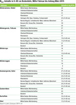 Der landesweite Mittelwert von gut 4500 beprobten Ackerbau-Standorten für den Nitrat-N-Gehalt beträgt 24 kg N/ha. Für die Winterungen lagen die Werte bei einer Bodentiefe von 0–90 cm bei 22 kg N/ha. Unter den geplanten Sommerungen (ohne Mais) wurde ein durchschnittlicher Nmin-Gehalt von 30 kg N/ha in einer Bodentiefe von 0–60 cm gemessen. Die Verteilung des Nitratstickstoffs in den einzelnen Schichten beträgt bei Winterungen 8 – 8 – 6 kg N/ha. Für Standorte mit einer durchwurzelbaren Bodentiefe von mehr als 60 cm, die nur auf zwei Schichten beprobt wurden, sollten für die 3. Schicht folgende Werte zusätzlich angerechnet werden: Winterweizen/Dinkel 8 kg N/ha, Wintergerste/Triticale 7 kg N/ha, Winterroggen 2 kg N/ha, Winterraps 3 kg N/ha,...
