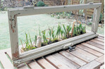 Material: Und so wird‘s gemacht: Das längliche Pflanzgefäß, das zuerst mit Moos umwickelt wird, bietet den Frühlingsblühern Platz. Moos, Geäst und Gräser werden eingearbeitet, sodass eine kleine, wuchshafte Landschaft entsteht. Das Gefäß wird im Rahmen eines alten Fensters mit Draht oder Kabelbindern befestigt und kann dann als lebendes Bild aufgehängt oder -gestellt werden. Hat man einen größeren Rahmen, kann man am oberen Rand noch einen Zweig als gestaltendes Element einfügen. Alternativ ist auch ein alter Bilderrahmen möglich.