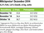 Im Dezember sind die Milchauszahlungspreise weiter gefallen. Gegenüber November (34,4 Cent) gingen sie um 0,6 Cent zurück auf durchschnittlich 33,8 Cent pro kg. Die Talsohle dürfe damit aber noch nicht erreicht sein. Fürs erste Quartal 2015 sind die Aussichten nicht gut. Freie Milch am Spotmarkt ist nur zu Dumpingpreisen zu verkaufen. Milch für Markenprodukte hält sich deutlich stabiler. Die Butter- und Käsebörse in Kempten schreibt in ihrem Bericht am 7. Januar: „Die Milchanlieferungen sind regional unterschiedlich zurückgegangen, im Osten der Bundesrepublik kam es teilweise zu Steigerungen. Diese konnten aber gut aufgenommen werden. Die Preise für Industrierahm und Milchkonzentrat haben wider Erwarten nicht so stark wie für die...