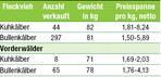 Die RBW-Kälberauktion am 8. Januar war mit 421 verkauften Kälbern ein gelungener Auftakt ins neue Versteigerungsjahr. Beim Fleckvieh stiegen die Preise etwas an. Die Vorderwälderkälber bestätigten das Niveau des Vormonats. Acht Kuhkälber kamen bei 71 kg auf einen Preis von 133 Euro pro Kalb. Bei den 44 Fleckvieh-Kuhkälbern stieg der Kilopreis deutlich auf 3,19 Euro. Am gefragtesten waren ein Scott- und ein Rotglut-Kuhkalb aus dem Betrieb Ewald in Bräunlingen. Sie erzielten die Tageshöchstpreise mit 700 Euro und 760 Euro. Bei den Vorderwälder-Bullenkälbern wechselten 65 Tiere den Besitzer. Je Kalb wurden netto 254 Euro bezahlt. Die 297 Fleckvieh-Bullenkälber kamen auf 392 Euro pro Kalb.