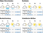 Am Samstag löst sich der Hochnebel in den Ebenen im Tagesverlauf, in Hochlagen scheint meist die Sonne bei Temperaturen von 14 bis 13°C am Rhein, im Mittleren Neckarraum und am Bodensee, 11°C auf der Alb und meist schwachem Wind. Am Sonntag bringt Wind aus Westen Wolken und Regen bei Temperaturen bis 11°C im Rheintal, 10°C im mittlerem Neckarraum sowie am Bodensee und 7°C auf der Alb. Am Montag dreht der Wind auf nördliche Richtungen, bringt dichte Wolken mit Regen und die Schneefallgrenze sinkt bis 500 Meter Höhe, die Temperaturen erreichen noch 8 bis 9°C im Rheintal und im mittleren Neckarraum, 7°C am Bodensee und 3°C auf der Alb. Am Dienstag lockert sich die Bewölkung von Süden her bei Temperaturen bis 8°C im Rheintal, 5°C am Bodensee...