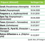 Das Bundesamt für Verbraucherschutz und Lebensmittelsicherheit (BVL) hat für die rechts in der Tabelle stehenden Mittel die Zulassungen verlängert. Diese Zulassungsverlängerungen werden bis zur endgültigen Entscheidung erteilt.