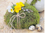 Und so wird es gemacht: 1. Für das Moosei wird Zeitungspapier zu einer Eiform geknüllt. Eine größere Platte Moos wird um das Zeitungspapier gelegt und mit Wickeldraht (auch Myrtendraht genannt) umwickelt. Jetzt wird die Eiform vollendet. 2.Mit einem spitzen Messer wird in die Eimitte ein Loch gebohrt. Es muss gerade so groß sein, dass ein kleines Reagenzglas hineinpasst. Weidenzweige und Wachteleier werden als Deko dazugelegt. 3.In das mit Wasser gefüllte Glas kommen Miniblütchen. Mit Kordel umwickelt, besticht das Ei mit seinem natürlichen Aussehen. Auf einem Tablett sind mehrere Moos-Eier eine wunderschöne Tischdekoration. Als Einzelstück ist es ein tolles Mitbringsel. Material: Zeitungspapier Moosplatte Wickeldraht Reagenzglas...