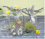 Material: Einmachgläser oder Glasvasen Moos Hühner- und Wachteleier Zweige Kordel Federn Narzissen Und so wird es gemacht: 1. Für eine Dekoration im Glas benötigen Sie zwei Gläser in unterschiedlicher Größe. Dies können alte Einmachgläser oder aber auch schlichte Glasvasen sein. Eines wird mit Moos bepflanzt und bei den Anderen werden am Glasboden Hühner- und Wachteleier eingefüllt. 2.In das Moosglas wird ein Mosaikei an einen hübschen Zweig gebunden. Das Ei wird damit in das Glas gehängt. 3.Bei dem Eiglas wird eine kleine Narzisse an den Zweig gebunden und ebenso abgehängt. Zu weit überstehende Zweige werden abgeschnitten. 4.Für das Mosaikei wird ein braunes Ei mit kleinen Splittern von einem weißen Ei beklebt. Dies ist zwar eine kleine...