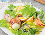 8 Eier (Größe M) 1/2 Kopf Endiviensalat 1 rote Zwiebel 1 rotschaliger Apfel 2 EL Apfelessig 2 TL mittelscharfer Senf Salz, Pfeffer 6 EL Öl 8 Scheiben Bacon etwas Schnittlauch