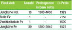 Mit 524 Tieren war die RBW-Auktion am 30. März gut beschickt. Alle Gattungen waren gefragt. Die Durchschnittspreise bei Großvieh und Kälbern stiegen teils deutlich. Holsteins: Mit einem Durchschnittsgemelk von 32,7 kg Milch präsentierten sich die zehn angebotenen Jungkühe gewohnt leistungsstark. Bei mittlerem Marktverlauf ergab sich hier ein Durchschnittspreis von 1329 Euro. Unangefochtenes Spitzentier war eine Short Cut-Tochter von Familie Stahl aus Zweiflingen-Westernbach. Neben einem hervorragendem Exterieur konnte sie 35,3 kg Milch vorweisen und wechselte zum Tageshöchstpreis von 1600 Euro in einen Zuchtbetrieb im Main-Tauber-Kreis. Fleckvieh: Der von Stefan Göggerle aus Rainau-Dalkingen angebotene Hubraum-Sohn erlöste 2150 Euro. Die...
