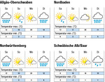 Am Samstag bringt auffrischender Nordwestwind dichte Wolken und Regenschauer bis in Hochlagen, die Temperaturen erreichen 13¿°C im Rheintal und am Bodensee, 11¿°C im Mittleren Neckarraum und 8¿°C auf der Alb. In der Nacht auf Sonntag gibt es in Höhenlagen Frost. Am Sonntag ziehen die Wolken ab, der Wind aus Nordwest frischt auf und die Temperaturen erreichen noch 11¿°C im Rheintal und bis 10¿°C auf der Alb. Am Montag zunächst Bodenfrost bis in tiefere Lagen, später lösen sich die Wolken bei leichtem Nordwind und Temperaturen bis 20¿°C im Rheintal und 16¿°C auf der Alb. Am Dienstag bringt auffrischender Wind aus Westen neue Wolken und Niederschläge, die Temperaturen steigen auf maximal 10¿°C in den Ebenen. Der Mittwoch bleibt wechselhaft...