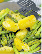 800 g neue Kartoffeln 800 g grünen Spargel 1 kleine Zwiebel 1 Knoblauchzehe 4 EL Olivenöl frische Estragonzweige Abrieb einer halben Biozitrone frisch gemahlener schwarzer Pfeffer Gewürzsalz
