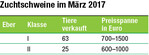 Im März kletterte das Preisniveau bei der Vermarktung von Schlachtschweinen und Ferkeln weiter. Die Stimmung übertrug sich zwar nur teilweise auf den Ebermarkt. Die gleichmäßige Nachfrage hielt aber die Verkaufszahlen der Eberzüchter in Baden-Württemberg im ersten Quartal stabil. Ingesamt wurden im März fast 90 Jungeber verkauft. Mit über 60 Tieren der Klasse I boten die Piétrain-Zuchtbetriebe vortreffliche Qualität. Die meisten hatten die Typisierung durchlaufen und waren in der Besamung gefragt. Verkäufe nach Spanien, Belgien und in andere Bundesländer begünstigten zusätzlich die Verkaufszahlen. Der Durchschnittspreis betrug 1080 Euro. Eber der Deutschen Landrasse kamen aus den Zuchtbetrieben Tobias Peter, Aach-Linz sowie Klaus und...