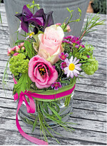 Material: Gräser, Zylinderförmiges Glas, Kautschukband, verschiedene Blüten Und so wird es gemacht: 1.Legen Sie die Gräser unsortiert kreuz und quer über ein schlichtes zylinderförmiges Glas und befestigen Sie es am äußeren Rand mit Kautschukband (auch Brautstraußtape genannt). Das Band ist elastisch und gibt so ausreichend Halt. Dieses ist in jedem Blumenladen zu bekommen. Alternativ kann man auch einen stabilen Gummiring verwenden. 2.Die fixierten Gräser dienen beim Drapieren als alternative Steckhilfe. Die Blüten werden durch den Grasdeckel gesteckt und finden so genügend Stabilität.