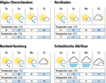 Der Samstag beginnt frostfrei mit Tiefsttemperaturen um 5¿°C in Hochlagen. Dann bringt frischer Wind aus westlichen Richtungen Schauer, bei milden Temperaturen bis 21¿°C im nördlichen Rheintal, im mittleren Neckarraum und am Bodensee und 16¿°C auf der Alb. Am Sonntag fallen Richtung Osten noch vereinzelte Schauer, von Westen her klart es langsam auf, bei meist schwachem Wind und gleichbleibenden Temperaturen. Auch die Nacht zum Montag bleibt frostfrei. Bis Montag folgen nochmals dichtere Wolken mit einzelnen Schauern, vor allem im Norden bei wenig Wind aus West bis Nord und gleichbleibenden Temperaturen. Am Dienstag lockern sich die Wolken dann zunehmend und die Temperaturen steigen leicht. Bis Donnerstag wird es sonniger und wärmer. |...