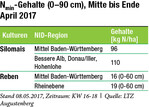 Die Beprobungen sind in den vergangenen zwei Wochen naturgemäß stark zurückgegangen. Beim Mais liegt das landesweite Mittel der Nmin-Werte in einer Bodentiefe von 0-90 cm bei 96 kg N/ha. Für folgende Kulturen endet in den nächsten Wochen der Beprobungszeitraum, in denen eine Düngungsempfehlung von den Laboren gegeben wird: Kartoffeln und Sonnenblumen: 15.06. Mais und Reben: 30.06. Junganlagen von Reben: 31.07. Für später gezogene Proben wird nur der Nmin-Gehalt mitgeteilt. In Wasserschutzgebieten, welche aktuell in die Nitratklasse II oder III eingestuft sind (Problem- oder Sanierungsgebiete), muss nach SchALVO (Schutzgebiets- und Ausgleichsverordnung) bei bestimmten Kulturen die Stickstoffdüngung nach der Nmin-Messmethode bemessen...