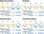Der Samstag beginnt mit Minima meist über 15¿°C und Sonne, die Temperaturen steigen bis 26¿°C im nördlichen Rheintal, mittleren Neckarraum und am Bodensee und 22¿°C auf der Alb. Dann bilden sich rasch Quellwolken, später verbreitet teils heftige Gewitter mit lokalem Hagelschlag. Der Sonntag wird meist regnerisch bei zeitweise frischem Westwind und Temperaturen um 20¿°C in den Ebenen und 15¿°C auf der Alb. Am Montag wechseln Wolken und Schauer, bei Temperaturen bis 20¿°C im Rheintal, mittleren Neckarraum, 16¿°C am Bodensee und 13¿°C auf der Alb. Der Dienstag wird eher wechselhaft, windig und kühl. Die folgenden Tage werden zunehmend freundlich und wärmer. | →Mehr Agrarwetter finden Sie im Internet unter www.bwagrar.de....