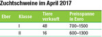 Die Vermarktung von Schlachtschweinen und Ferkeln lief im April weiterhin gut; bei stabil hohen Ferkelpreisen. Die Verkaufszahlen der Eberzüchter in Baden-Württemberg bekam aber eine kleine Nachfrage-Delle. Lieferverschiebungen im Export und Kaufzurückhaltung bei der Besamung drückten die Ergebnisse. Es konnten knapp über 60 Jungeber vermarktet werden. Darunter vorwiegend Klasse I-Eber mit hohen genomischen Zuchtwerten. Es gab kleinere Exporte in andere Bundesländer und in die Nachbarstaaten Belgien und Frankreich. Der Durchschnittspreis aller verkauften Tiere lag bei 1125 Euro. Eber der Deutschen Landrasse wurden wenige vermarktet und kamen von Klaus und Philipp Benz in Bingen. Die Söhne von Cabrio und Sulfit zeigten sich mit guter Länge...